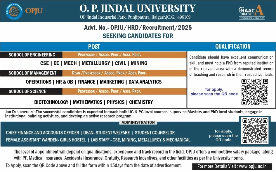 OPJU University is a great place to work, learn, and grow. As a dynamic, forward-looking institution committed to becoming a centre of excellence in innovation, research, teaching, and learning, we offer a diverse range of opportunities for professional development in a vibrant educational and research environment.
