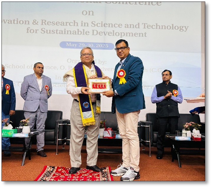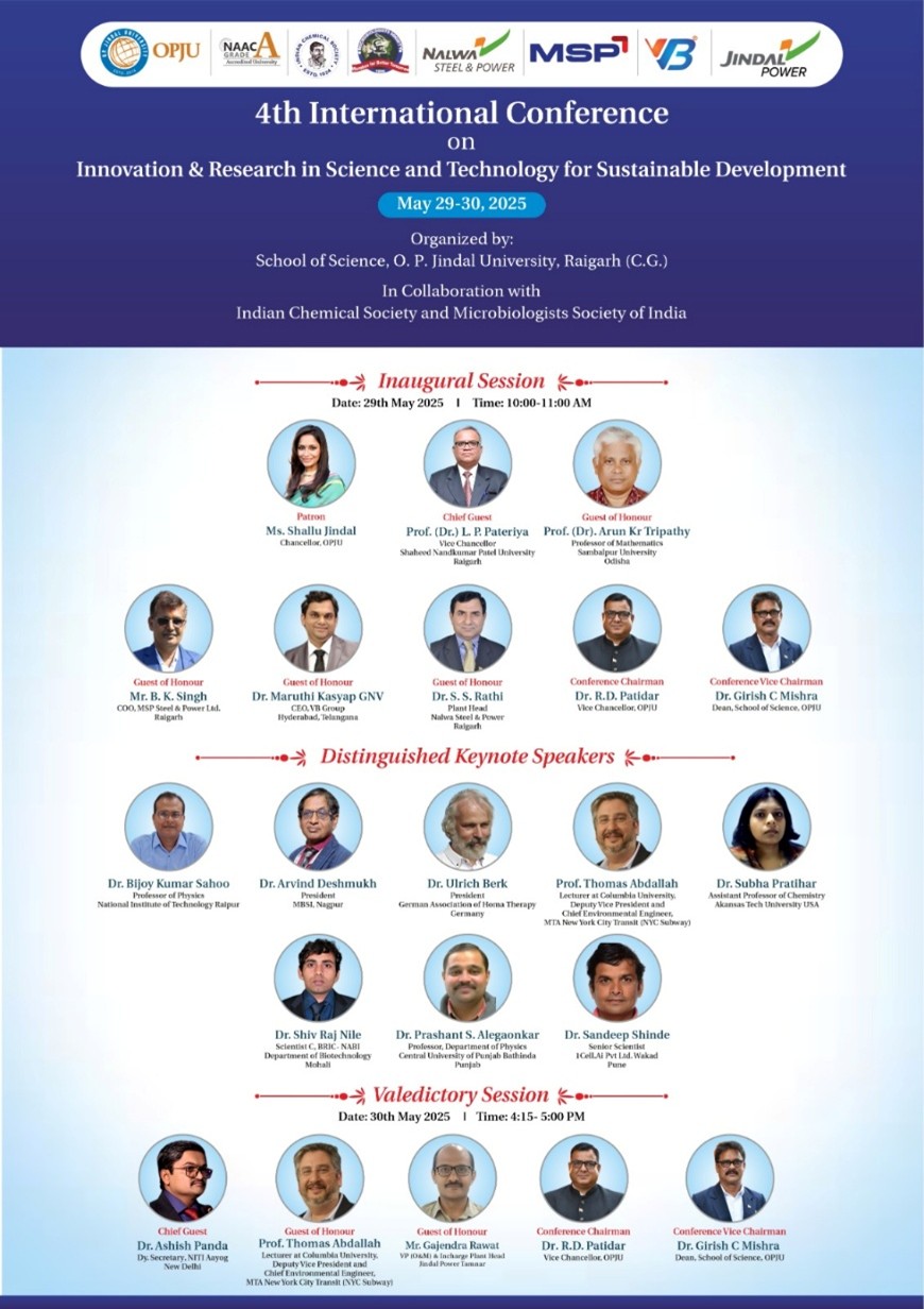 The School of Science, O.P. Jindal University has successfully conducted the “4th International Conference on Innovation and Research in Science & Technology for Sustainable Development (ICIRSTSD-25)” on 29-30 May 2025. The Inaugural Session was graced by Prof. (Dr.) L. P. Pateriya, Hon'ble Vice Chancellor of Shaheed Nandkumar Patel University, Raigarh as the Chief Guest and Dr. Arun K. Tripathy, Professor of Mathematics at Sambalpur University, Odisha; Dr. S. S. Rathi, Plant Head of Nalwa Steel & Power, Raigarh; Dr. Maruthi Kasyap GNV, CEO of VB Group, Hyderabad as Guests of Honour. Dr R.D. Patidar, Chairman of ICIRSTSD-25 and Vice Chancellor, OPJU in his welcome address congratulated the School of Science and the organizing committee for organizing the Fourth Version of ICIRSTSD-25 as a landmark conference on such a relevant topic in demand of the current global scenario. The Chief Guest also emphasized the inevitable need of research and innovation in the present situation in the Higher Education Institutions for sustainable and equitable growth and advancement of society. Dr Girish Chandra Mishra, Vice-Chairman of ICIRSTSD-25 and the Dean, School of Science presented the vote of thanks, expressing gratitude to all participants, sponsors, and organizers. The conference attracted significant academic interest by receiving 200 papers, and 145 quality papers were accepted, including 10 international submissions. It featured four keynote sessions with a total of nine distinguished keynote talks, providing insights into cutting-edge research and sustainable technological solutions. The scientific program included 12 technical sessions spread across four thematic tracks: two sessions in Physical Sciences (Track 1), and three sessions each in Chemical Sciences (Track 2), Mathematical Sciences (Track 3), and Biotechnology, Environment & Health Sciences (Track 4). A dedicated poster presentation session was also held to encourage interactive discussion. The conference successfully served as a dynamic platform for researchers, academicians, and industry experts to exchange ideas, promote interdisciplinary collaboration, and emphasize innovation for sustainable development. The Valedictory Session was held online with the presence of Dr. Ulrich Berk, President, German Association of Homa Therapy, Germany as the Chief Guest and Mr. Thomas Abdallah, Lecturer at Columbia University, Deputy Vice President and Chief Environmental Engineer, MTA New York City Transit (NYC Subway) as the Guest of Honour. Both the international delegates congratulated the School of Science, O.P. Jindal University for hosting such a conference on a very important and relevant topic. Dr R.D. Patidar, Chairman of ICIRSTSD-25 and Vice Chancellor, OPJU congratulated to the team members of the School of Science and Organizing Committee for the tireless efforts to successfully conducting the conference. Dr Taniya Sengupta Rathore, Convener-ICIRSTSD-25 presented the conference report and Dr Ankur Rastogi, Convener-ICIRSTSD-25 presented the vote of thanks.