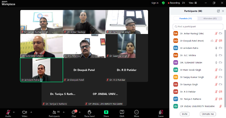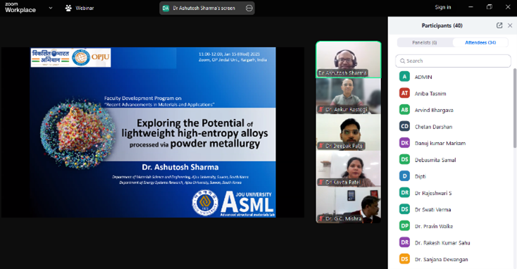 The Department of Chemistry, School of Science, OP Jindal University Raigarh, successfully organized a one-week online Faculty Development Program (FDP) on "Recent Advancements in Materials & Applications" from 13th to 17th January 2025. The program saw enthusiastic participation from over 120 registrants across India, representing various academic institutions and research organizations. A total of 15 distinguished speakers from India and abroad delivered their keynote talks on the theme of the FDP. Dr. Ankur Rastogi, Sr. Associate Professor, Department of Chemistry was the convener of the FDP.