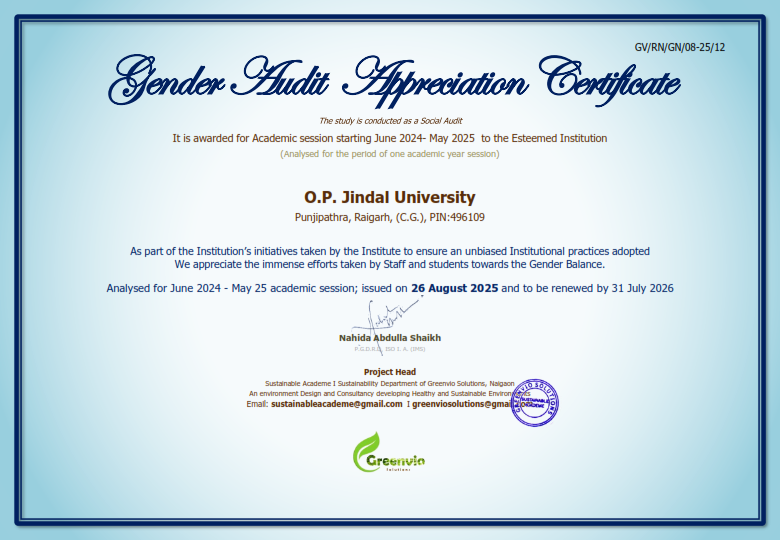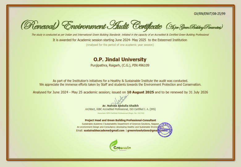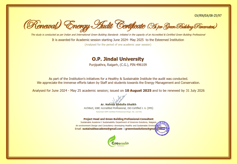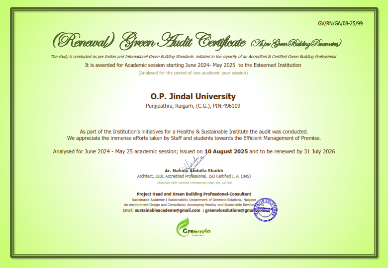 OP Jindal University is committed to sustainability and environmental responsibility. It actively engages in sustainability audits such as energy, environment, and green audits to assess and improve its ecological footprint. Through these initiatives, the university identifies conservation opportunities, reduces waste, and promotes eco-friendly practices.